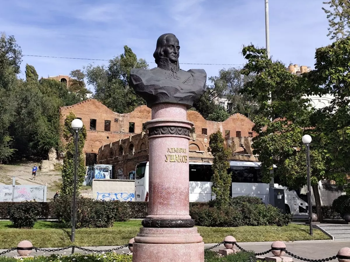 Если пройти дальше, вдоль Парамоновских складов, можно увидеть бюст адмирала Ушакова на цилиндрической гранитной колонне. Он стоит у Дона не случайно — именно здесь адмирал учился в Морском кадетском корпусе, потом служил в Азовской флотилии и даже был произведен в лейтенанты в крепости Дмитрия Ростовского.