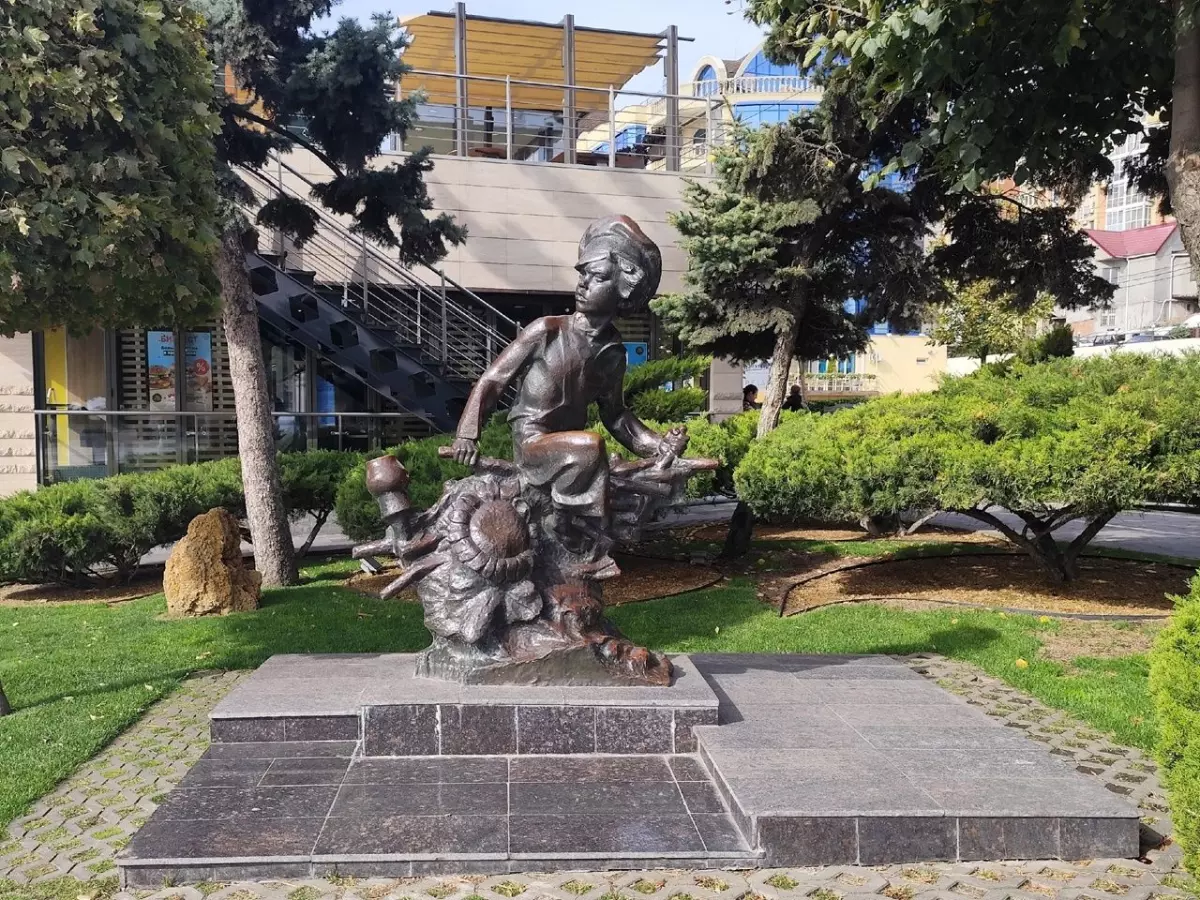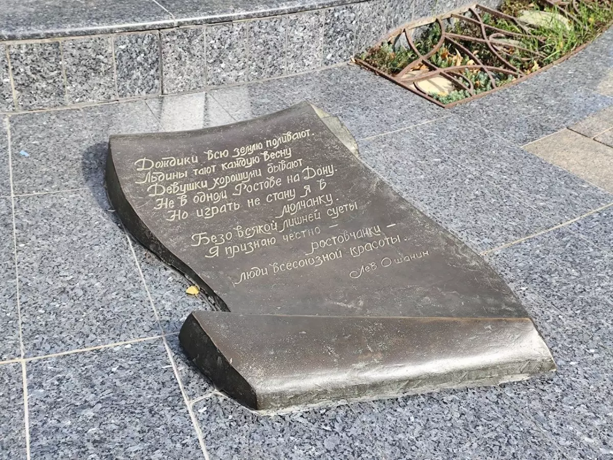 Следующая достопримечательность встречает горожан рядом с причалом № 24. Знаменитая «Ростовчанка» — бронзовый памятник красоте донских дам. Авторство тоже принадлежит Анатолию Скнарину. Ходят слухи, что в прекрасной девушке на набережной скульптор воплотил образ любимой супруги. На постаменте памятника «лежит» бронзовый свиток со стихотворением «Ростовчанки» авторства Льва Ольшанина.