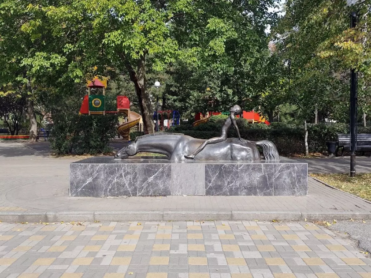 Первая остановка — скульптура «Купание коня» на территории бывшей Доломановской слободы. У композиции есть второе название – «Лето». Автором является знаменитый скульптор Анатолий Скнарин. Благодаря невысокому постаменту на спину бронзового коня часто садятся играющие дети или туристы для фотографий.