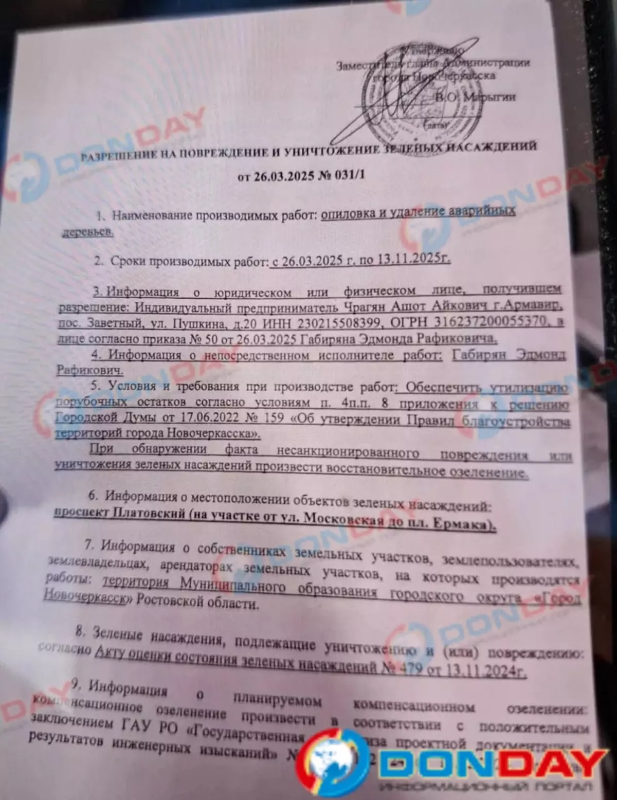 В распоряжении Donday оказался документ, подписанный представителем администрации Новочеркасска о вырубке елей на алее. В этом документе говорится о том, что деревья признаны аварийными и подлежат сносу.