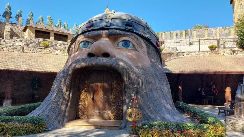 Оформлен парк в стиле русских народных сказок и былин. Территория огорожена крепостными стенами с изящными башенками, по искусственно созданной реке плавают утки и лебеди, в прудах с кувшинками резвятся разноцветные рыбки.
