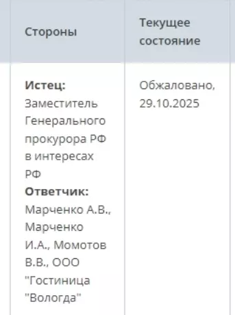 На сайте суда 29 октября появилась информация, что защита подала апелляцию на решение Останкинского суда Москвы по иску Генпрокуратуры об изъятии 97 объектов недвижимости судьи Верховного суда в отставке Виктора Момотова и владельца сети отелей «Мартон» (Marton) Андрея Марченко.