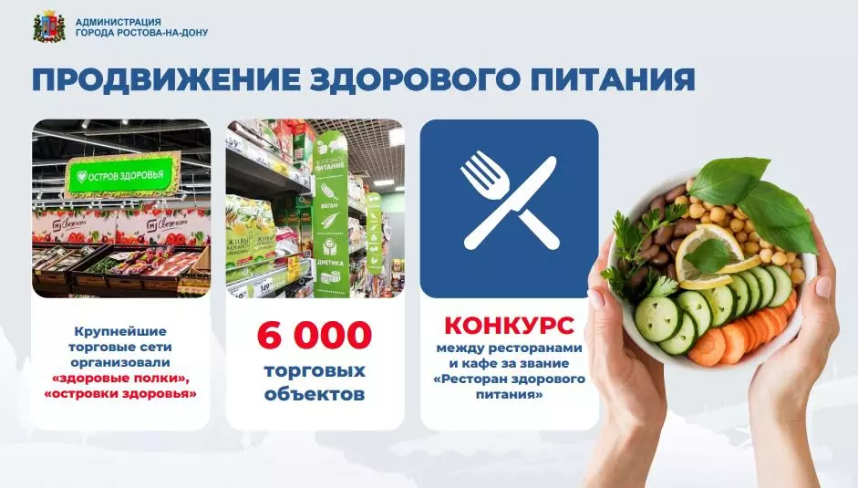 В России дан старт новому движению «За медицину здорового долголетия». В качестве основных партнеров данной инициативы в донской столице выступят шесть ранее учрежденных центров здоровья. Кроме того, разработают форматы для популяризации здорового питания. Предприятия общественного питания подключат к данной работе — крупнейшие сети уже внедряют «островки здоровья» и концепцию «здоровых полок» в магазинах.