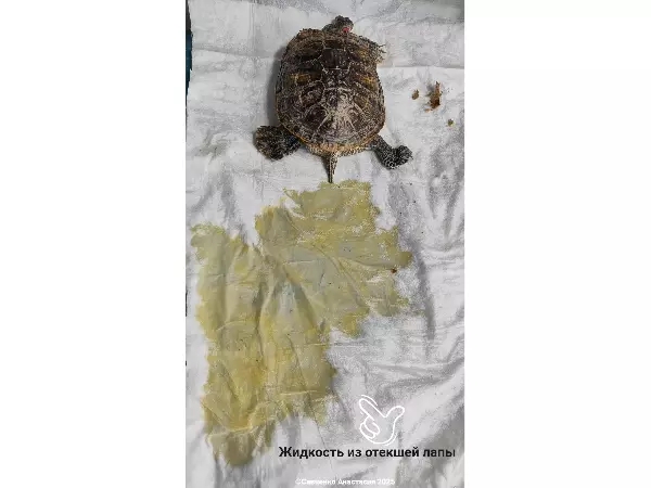 К девушке на прием попала красноухая черепаха с опухшей лапой. Причина крылась в напольном содержании питомца. Когда-то давно он ползал по полу и на его лапу намотались волосы. Возникшую проблему вовремя не заметили и не смыли после прогулки. В результате конечность черепахи стала отекать.