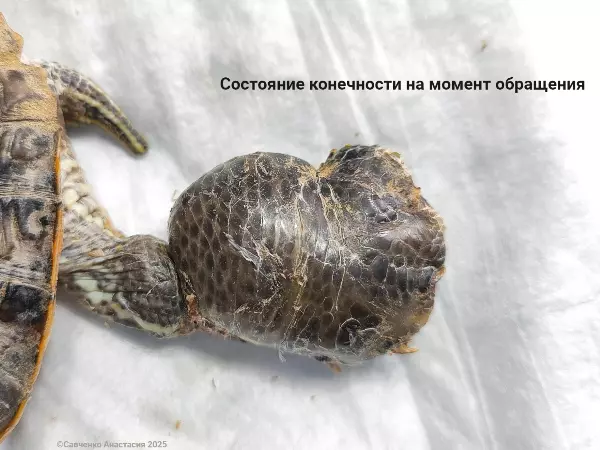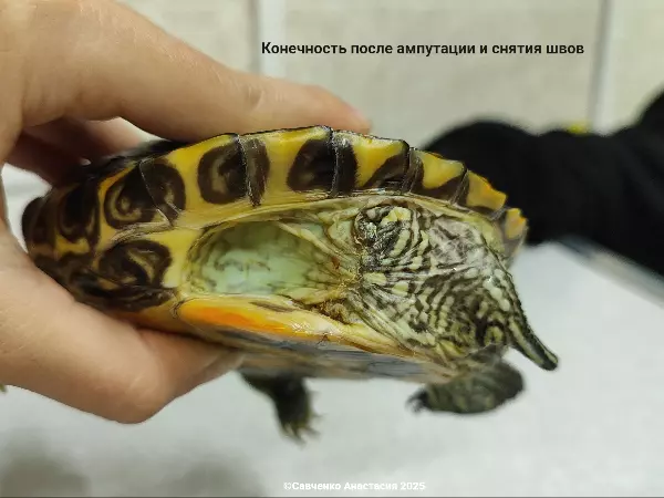 Хозяин питомца выполнял все необходимые рекомендации врача. Но при этом черепаха все также много времени проводила на полу. Вскоре пациент попал к Анастасии снова с той же проблемой. На месте перетяжки вновь собрались волосы, а в разрез попала инфекция.