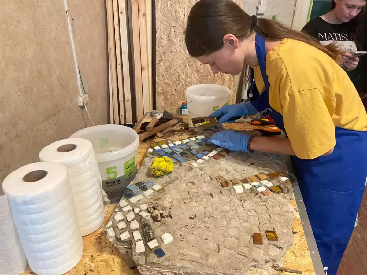 Десятки волонтеров приняли участие в работе. На протяжении четырех месяцев два раза в неделю неравнодушные люди занимались очисткой плит, переносом эскиза рисунка мозаики на кальку и укладкой камушков в бетонный раствор.