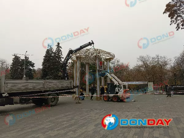 Перед входом уже установили большие колонны. С помощью небольшого крана рабочие закрепляют крышу на столбах. Неподалеку лежат остальные детали с новогодними лампочками. Из-за работ огороженную территорию временно приходится обходить.