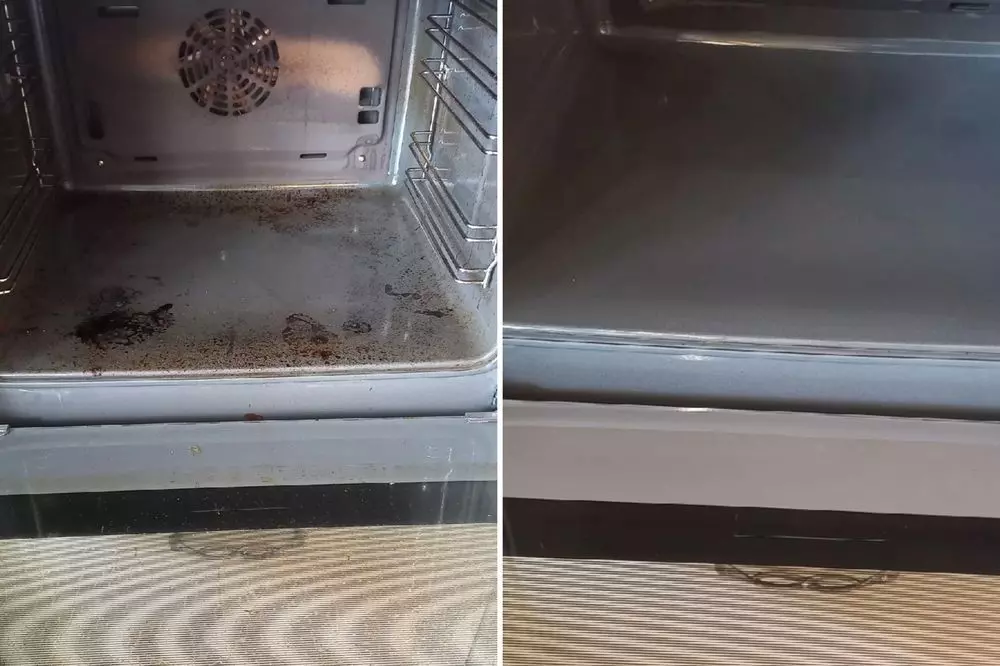 Сначала надо снять решетки и противни, нанести гель или распылить средство на внутреннюю поверхность холодной духовки, включая дверцу (только не задеть нагревательные элементы).