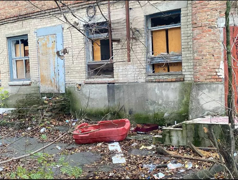 По словам местных жителей, здание было построено еще в послевоенное время, в 1961 году. Оно добротное, с толстыми стенами, зимой там тепло. Вот уже несколько лет здание закрыто. Территория заросла травой и деревьями, стекла в окнах выбиты, там ночуют маргиналы, а совсем рядом расположен работающий детский садик.