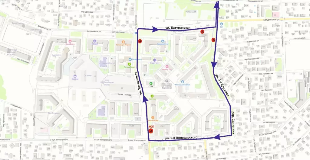По адресам: ул. Тружеников/бул. Платова, 41/170, ул. Тружеников, 31/157, ул. Батуринская, 151/ул. 3-я Круговая, 66 (южная и западная стороны) изменятся схемы движения автобусов №№ 41, 56 и 72 на ул. 3-й Круговой, ул. 2-й Володарского, ул. Тружеников и ул. Батуринской.