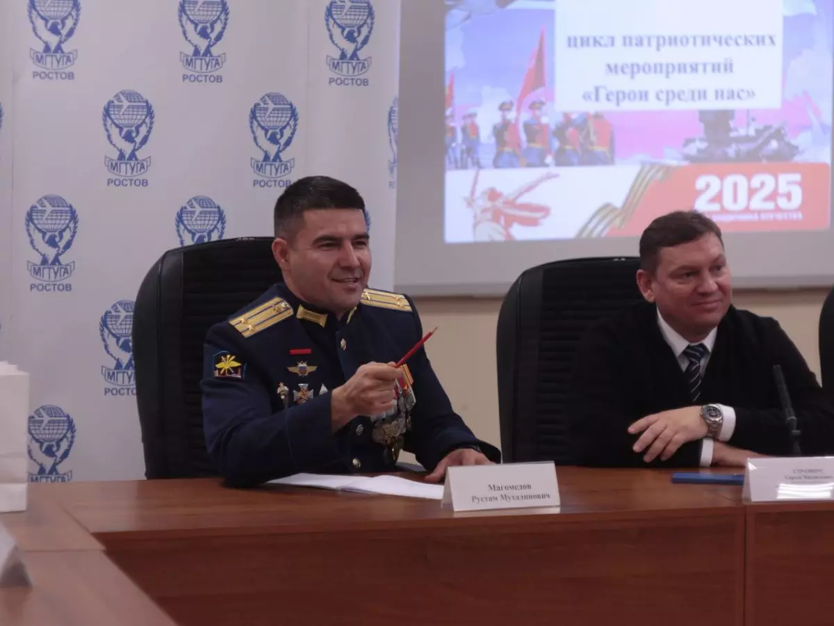 В рамках цикла мероприятий «Герои среди нас», приуроченного к Году защитника Отечества, в Ростовском филиале Московского государственного технического университета гражданской авиации (МГТУ ГА) 23 декабря прошла уникальная встреча, организованная директором учебного заведения Викторией Пашинской. Пообщаться со студентами очного отделения приехал трижды кавалер ордена Мужества, подполковник Рустам Магомедов. Участник специальной военной операции и кадровой программы «Герои Карачаево-Черкесии», а также начальник Военного учебного центра при Северо-Кавказской государственной академии, он сам учится на заочном отделении Ростовского филиала. Своим товарищам по учебе Рустам Магомедов решил рассказать о боевых буднях военного спасателя.