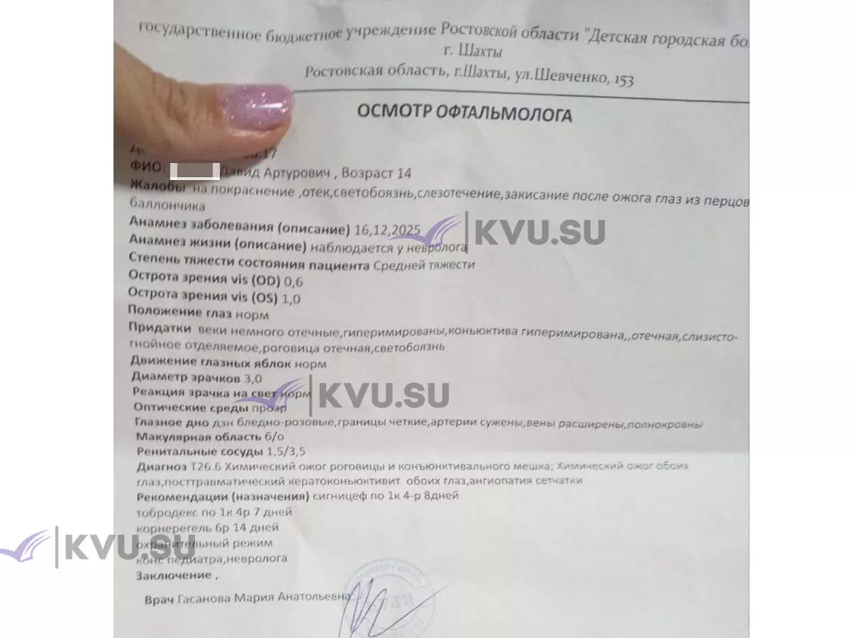 Мама Давида, узнав о произошедшем, вызвала скорую помощь. Давида госпитализировали в шахтинскую больницу, а затем перевели в Ростов. Врачи диагностировали химический ожог роговицы и конъюктивального мешка. По словам родственников, один глаз частично лишен зрения.