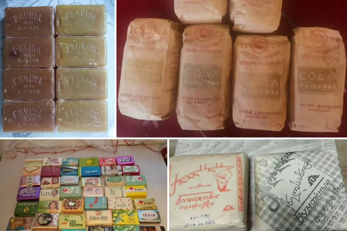 Здесь — банное мыло, произведенное Ростовским масложиркомбинатом «Рабочий»: хвойное, яичное (для буржуев есть варианты из Финляндии, ГДР, Индии), пачки бумажных салфеток по 50 копеек, пищевая сода 1992 года выпуска (ГОСТ!). В 2025 году ей исполнилось 60 лет. Купить полувековую пачку можно за 2 500 рублей.