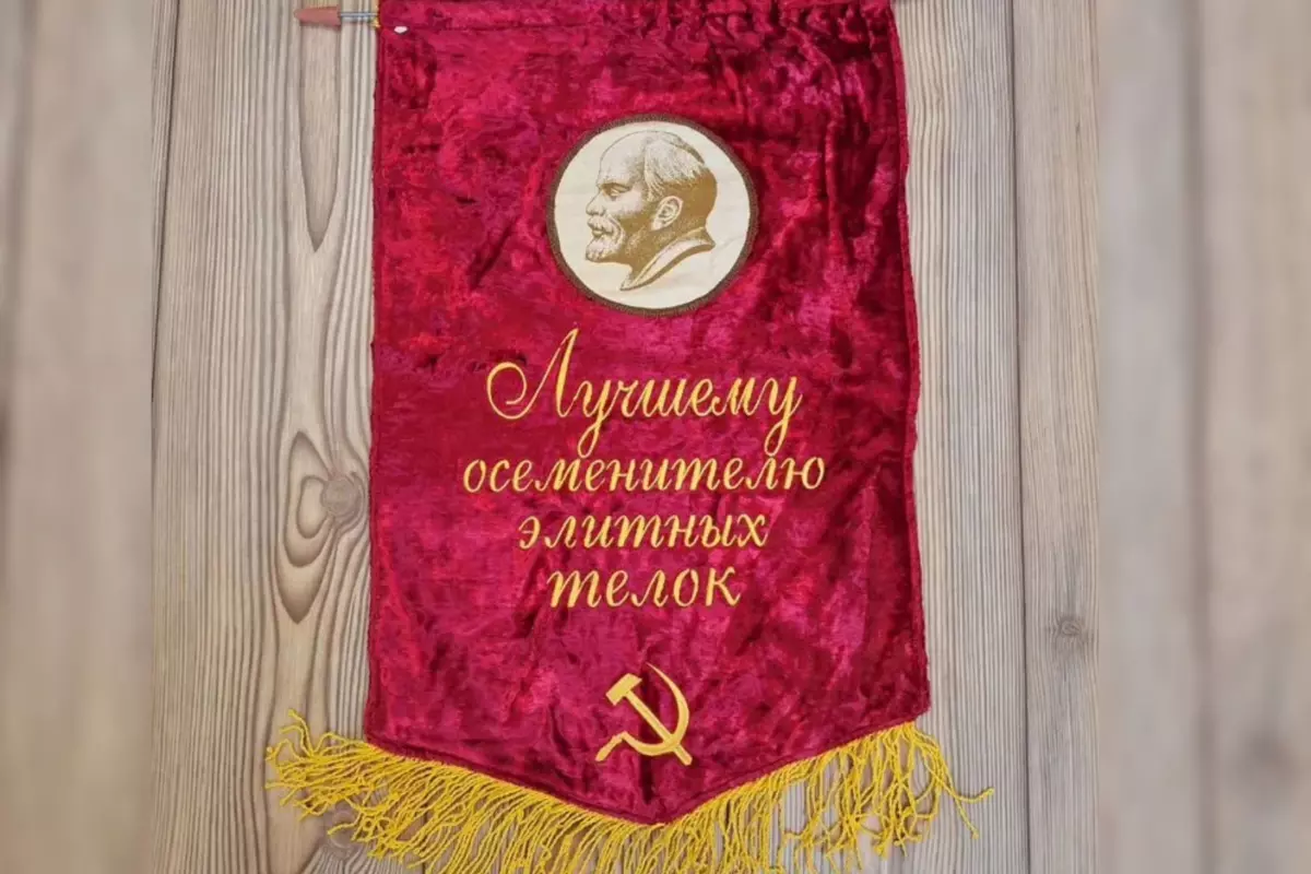 Другой интересный экземпляр — эпохальный симбиоз идеологии и сельского хозяйства 70-80-х, вымпел «Лучшему осеменителю элитных телок». На бархатной ткани – портрет Ленина. Купить такое можно за 6 200 рублей