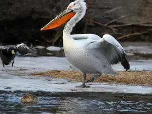Кудрявый пеликан пританцовывает. А селезень явно нацелился на утку.