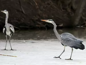 Дикие серые цапли на льду пруда в Ростовском зоопарке.