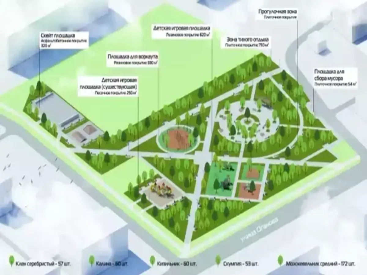 Согласно первоначальному паспорту объекта, работы стартовали 28 марта и должны закончиться уже к 31 октября. Однако на портале госзакупок сроки исполнения контракта изменены – до 31 декабря.Фото: план сквера Оганова.
