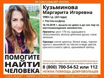 Маргарита Кузьминова пропала 16 октября 2018 года. Она жила с родителями в многоэтажном доме в ЖК «Суворовский» на улице Платона Кляты. В тот день она вышла поговорить по телефону и исчезла.