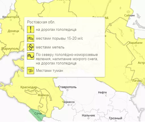 Желтый уровень погодной опасности сообщает о потенциально опасных погодных условиях. Так, местами в донском регионе ожидаются гололедно-изморозевые отложения, местами - метель, шквалистый ветер с порывами до 20 метров в секунду, а также налипание мокрого снега. Продлятся эти природные явления в донском регионе как минимум до конца выходных.