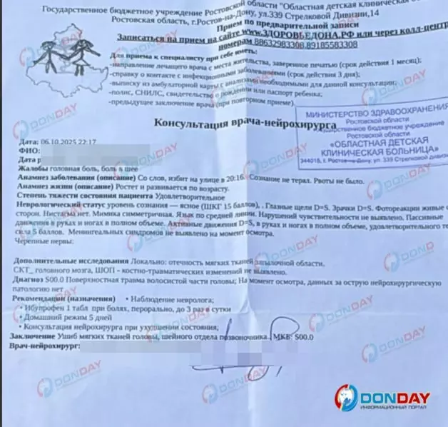 Придя домой, подросток рассказал обо всем родителям. Те срочно отвезли его в детскую больницу. Нейрохирург Областной детской клинической больницы диагностировал у мальчика ушибы головы и шейного отдела позвоночника. Ребенка отправили на лечение.
